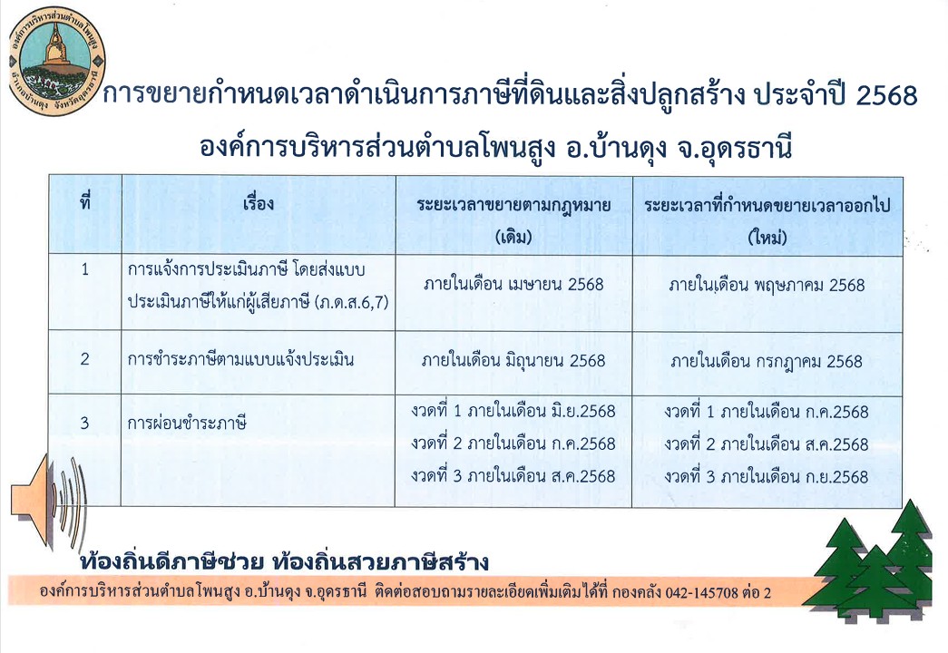 หน้าแรก » การดำเนินงาน » ข่าว » ข่าวประชาสัมพันธ์ » ประกาศเรื่อง การขยายกำหนดเวลาดำเนินการตาม พรบ.ภาษีที่ดินและสิ่งปลูกสร้าง พ.ศ.2562 ประจำปี 2568
