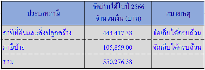 ตาม พรบ.ภาษีที่ดินและสิ่งปลูกสร้าง พ.ศ.2562 และ พรบ.ภาษีป้าย พ.ศ.2510 โดยมีรายละเอียดผลการจัดเก็บรายได้